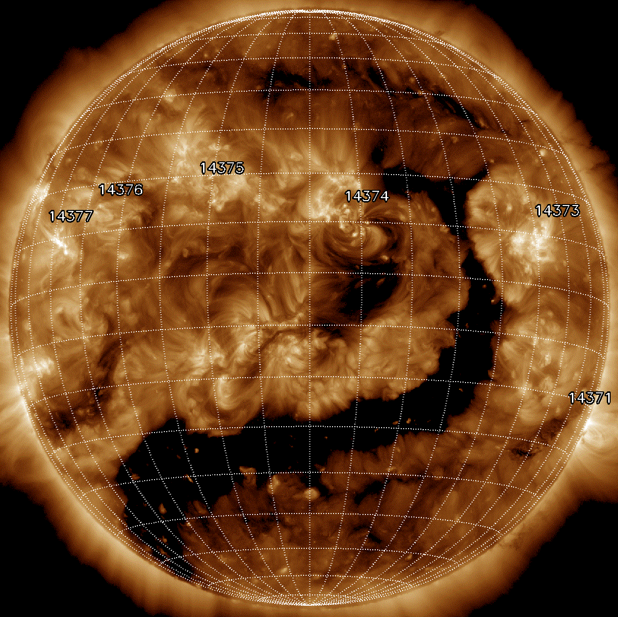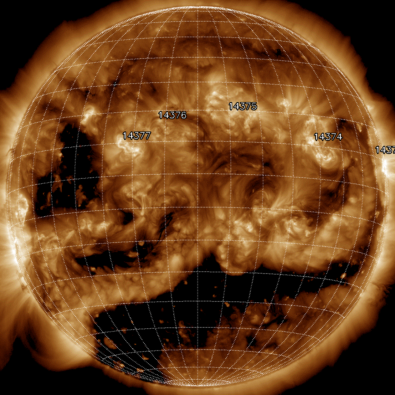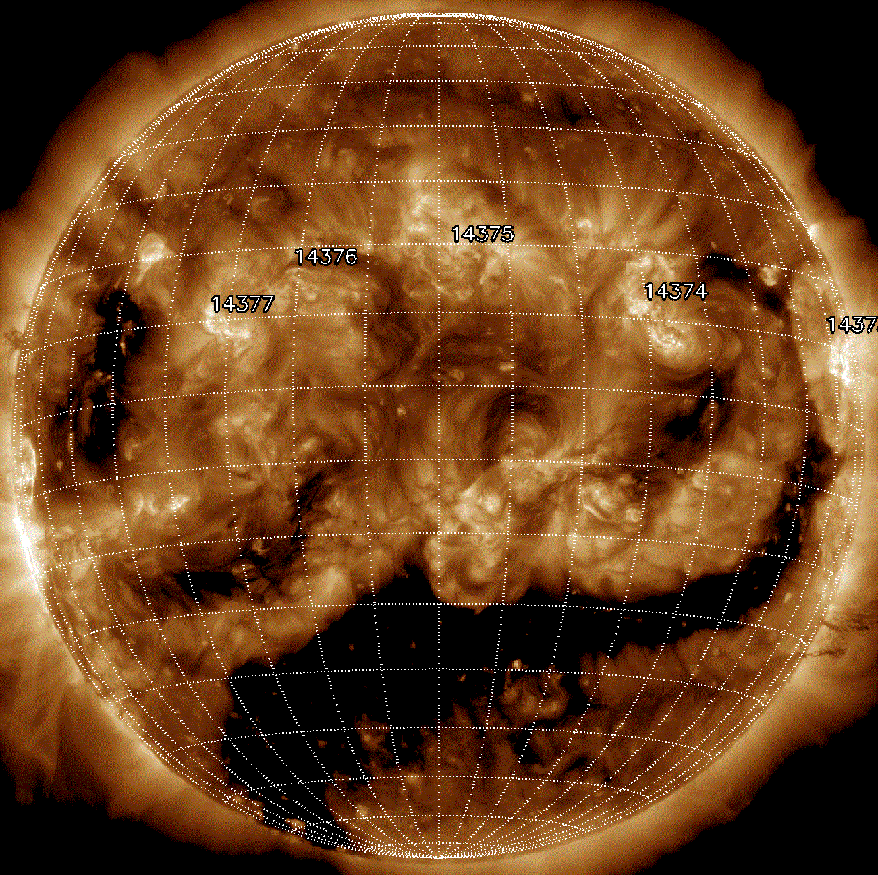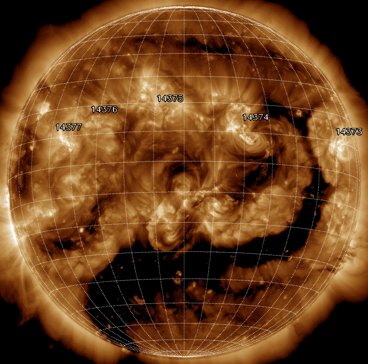 14 февраля в NE-квадранте находилась малоактивная группа пятен 4377 с площадью 60 МДП, числом