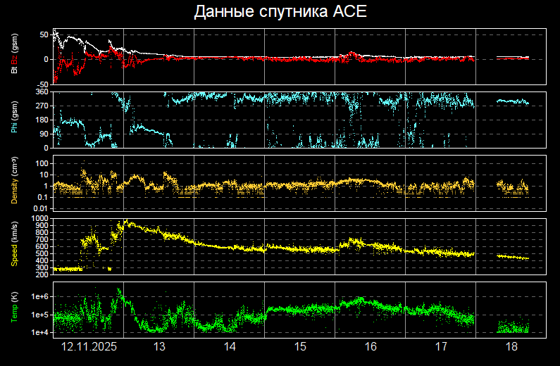Затем скорость солнечного ветра начала уменьшаться и к 01.// UTC 16 ноября достигла значения 550 км/сек,