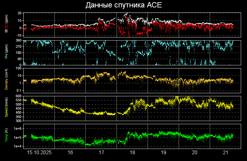 Затем скорость солнечного ветра начала снижаться и к 05.// UTC 19 октября достигла значения 460 км/сек,
