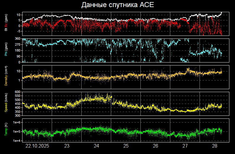 Затем скорость солнечного ветра начала уменьшаться и к 12.// UTC 27 октября достигла значения 350 км/сек,